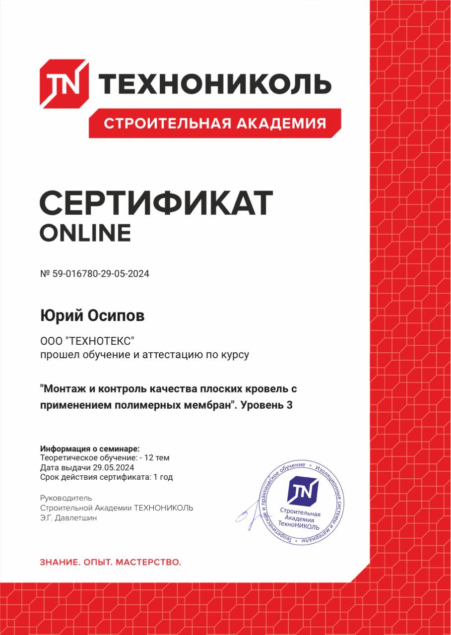 Здравствуйте уважаемый заказчик. Меня зовут Осипов Юрий Геннадьевич. Управляющий направлением ПВХ кровля, компании Технотекс.Наша компания занимается профессиональным монтажом и ремонтом плоской и скатной кровли, материалами на основе ПВХ мембран под ключ.